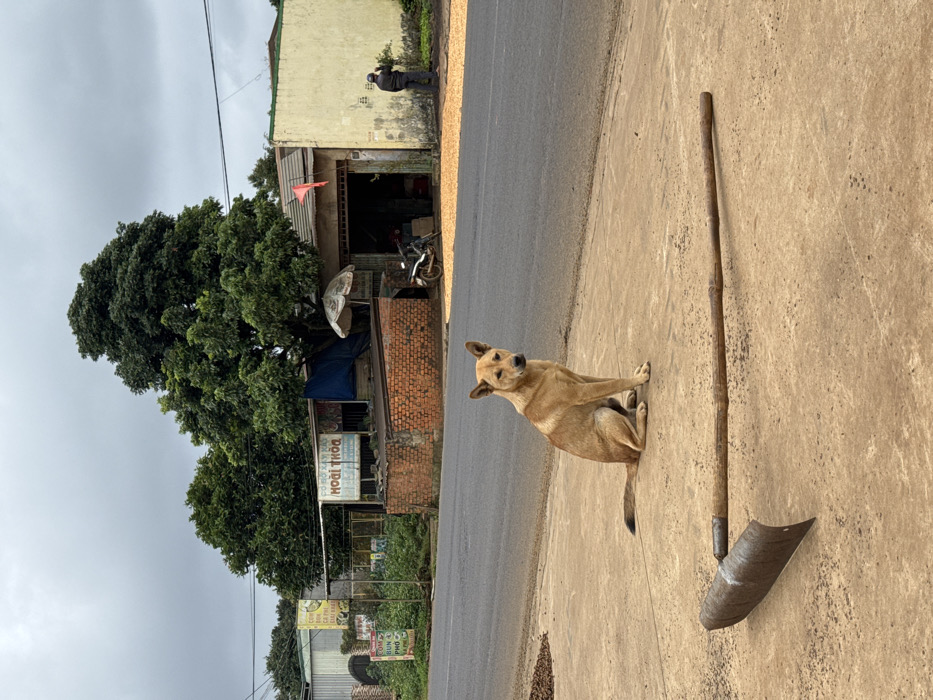 A dog sits on a concrete surface beside a large shovel. The dog is tan with pointed ears. Behind the dog, a road stretches into the distance. On the other side of the road, lush green trees surround a building with a red flag. A person stands near the building, and a motorcycle is parked underneath a canopy. Various signs are visible in front of the building. The sky is overcast and gray.