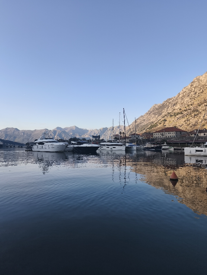 The scene depicts a tranquil waterfront in Kotor, Montenegro, under a clear, light blue sky