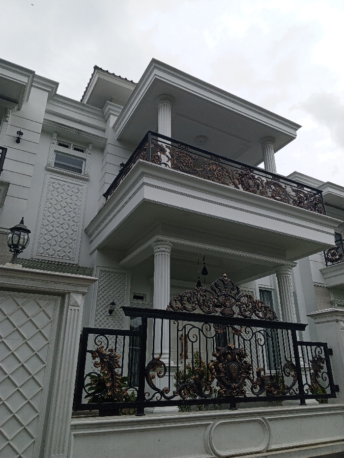 An ornate two-story building features white exterior walls, prominent columns, and detailed decorative accents. A wrought-iron fence with elaborate gold-toned embellishments surrounds the property. Balconies with equally ornate railings extend from the upper floors. The architecture displays a classical style with a touch of modern design. The sky is overcast.