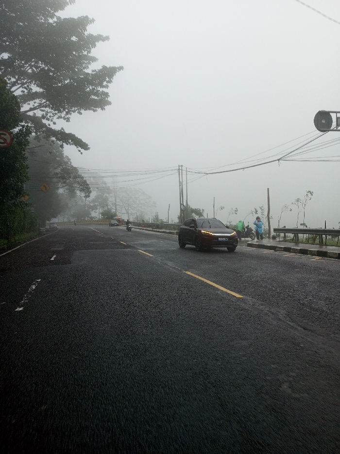 The scene depicts a foggy, overcast day on a wet asphalt road in Dawathang_Dorjibi_ Kashingtsawa, Bhutan