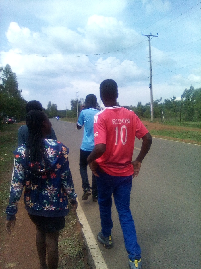 Four individuals are observed walking along the shoulder of an asphalt road in South Sakwa ward, Kenya