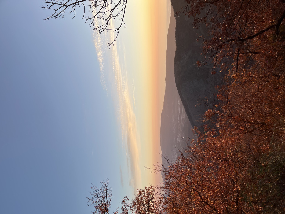 An image of a mountain landscape in the late afternoon. The sky is a gradient of blue to gold, with light clouds near the horizon. A silhouette of a mountain range is visible. The foreground is filled with trees having dry, brown leaves. Bare branches reach into the sky.