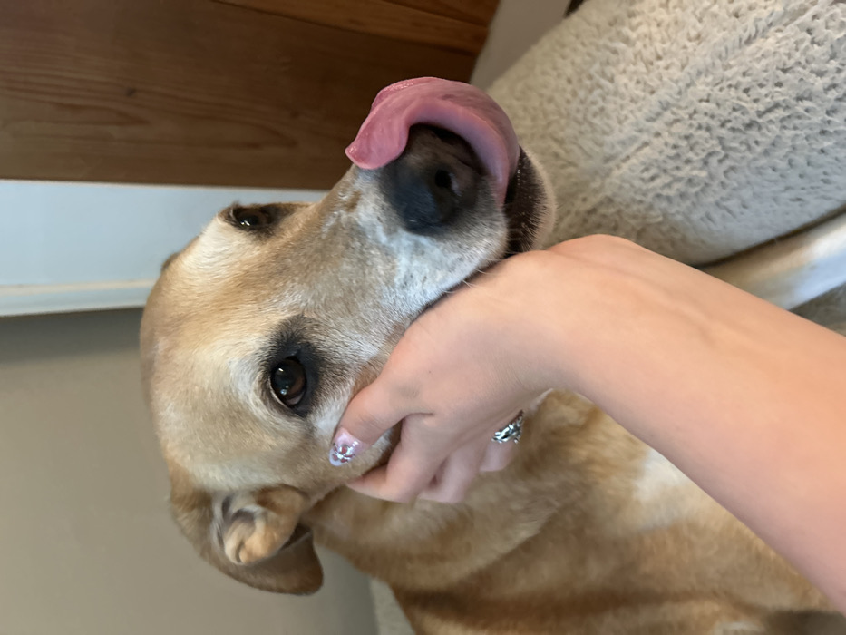 A light brown or tan-colored short-haired dog is depicted indoors in Whistler, Canada, engaged in self-grooming. Its black nose is being licked by its pink tongue, which is curled upwards. A human hand with light skin, manicured fingernails featuring a white/silver design on the ring finger, and a silver-toned ring on the ring finger is gently cupping the dog's left cheek. The dog's dark brown eyes are visible. The background consists of a plain light-colored wall to the left and a wooden surface, possibly a door or furniture, to the right. The dog appears to be resting on a light-colored, textured surface, likely a pet bed or blanket.