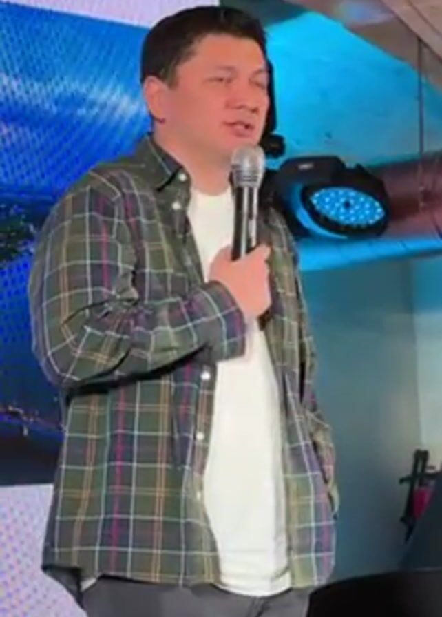 The video depicts a man speaking into a microphone while standing in front of a screen. He is dressed in a green, plaid, button-down shirt over a white T-shirt and dark gray jeans. The man is holding the microphone in his left hand, while his right hand is in his pocket. The screen behind him is partially visible and features an image in blue hues. To the right of the man, there's a lighting fixture mounted on a pipe. The setting appears to be a presentation or speaking event in a room with mixed lighting.