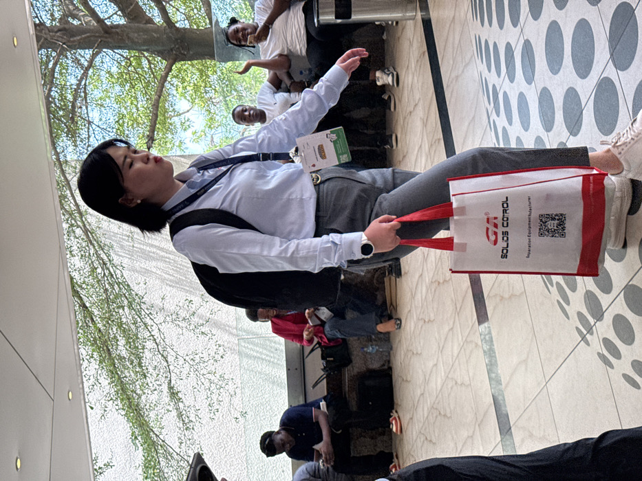 An Asian female, mid-twenties, with short black hair, is observed in a dynamic stance, walking from left to right across a tiled floor featuring a gray circular pattern. She wears a light blue long-sleeved button-up shirt, dark gray trousers, and white sneakers. A black backpack is on her shoulders, and a white smartwatch adorns her left wrist. Around her neck is a blue lanyard with multiple event badges, one green visible badge stating "SUSTAINABILITY." In her right hand, she carries a white and red tote bag featuring the text "GR SOLIDS COTROL Separation Equipment Manufacturer" and a QR code. Her facial expression is neutral, slightly downturned. In the background, on the left, a dark-skinned male in a dark t-shirt and dark pants with red and white sneakers is seated, looking at a mobile phone. Next to him, a dark-skinned female in a red blazer, dark pants, and heels is also seated, engaged with an item in her hands. On the right background, three dark-skinned individuals are seated. One male wears a white polo shirt. Two females wear white tops; one gestures with her right hand raised, while the other holds a mobile phone and smiles. The setting appears to be an indoor or semi-open public space with a light-colored tiled floor. A horizontal dark line is present on the floor in the mid-ground. Behind the seated individuals, green trees with leaves are visible, suggesting an open window or outdoor area beyond the immediate structure. A silver cylindrical waste receptacle is visible on the far right. This scene takes place in Itirin, Nigeria.
