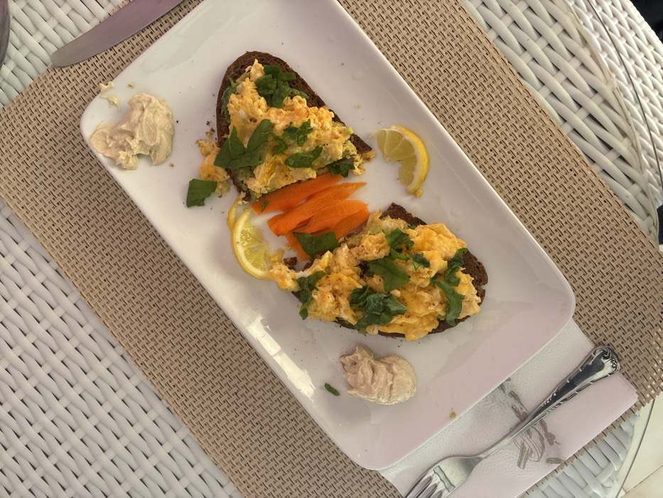 Two slices of dark bread topped with scrambled eggs and scattered fresh green herbs are arranged on a white rectangular plate. Between the slices are short, peeled carrots and lemon wedges. A dollop of hummus sits beside each slice. A fork lies on a pink napkin to the lower right of the plate, while a knife rests on the upper left side. The plate is on a woven placemat that sits on a white wicker table.