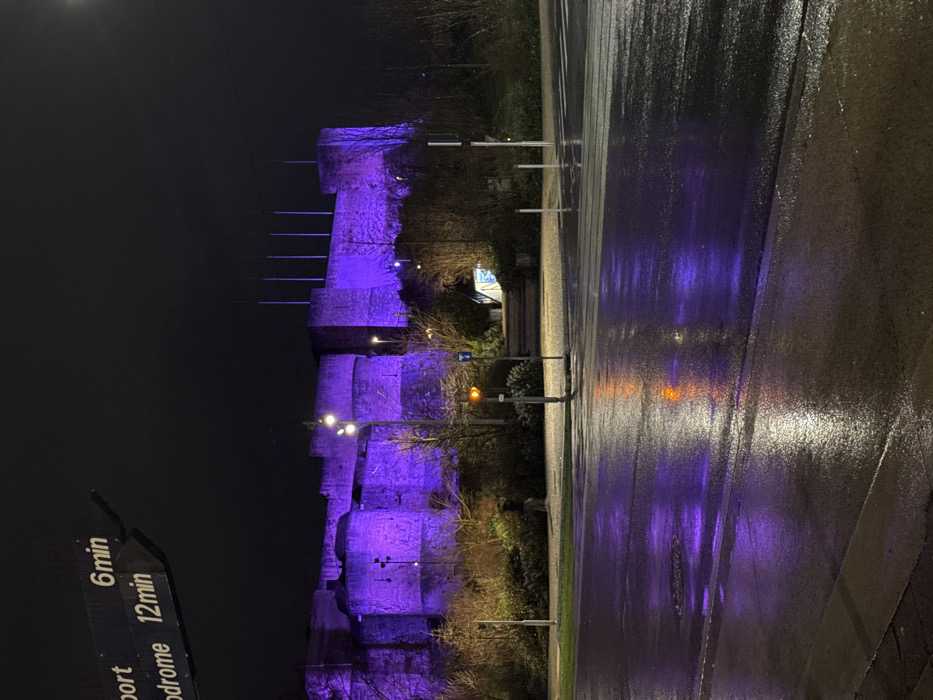 - "A sideways view shows a purple-lit stone castle at night, next to a wet road that reflects the purple light" by FM-T8WW23, licensed under CC BY 4.0