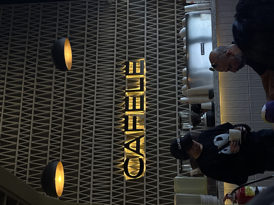 An establishment's facade showcases a textured wall, adorned with a vertical, illuminated "CAFELELE" sign. Flanking this signage are two spherical light fixtures emitting a warm glow. Patrons are visible near the counter, one holding a cup while wearing a black cap and sweatshirt, and another standing by a machine. The setting suggests a bustling café environment.