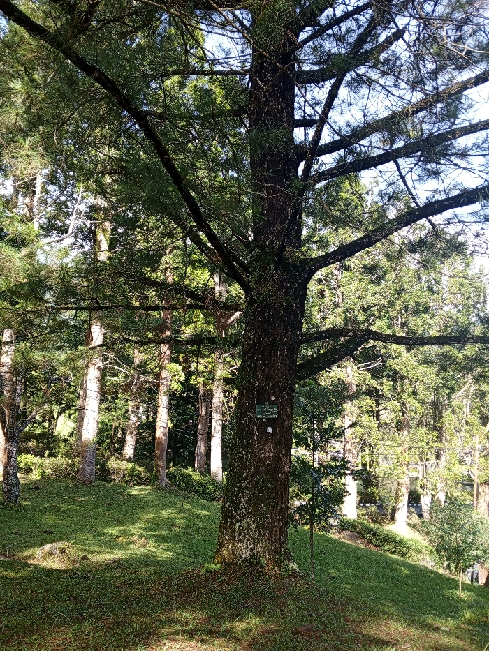 A dense forest scene, dominated by a tall pine tree with prominent horizontal branches extending from its textured trunk. The foreground features a grassy slope dappled with sunlight and shadows. In the background, multiple slender trees rise towards the sky, their pale trunks contrasting with the dark foliage. A small, green sign is attached to the main tree trunk, partially obscured. The overall impression is one of a tranquil, wooded environment.
