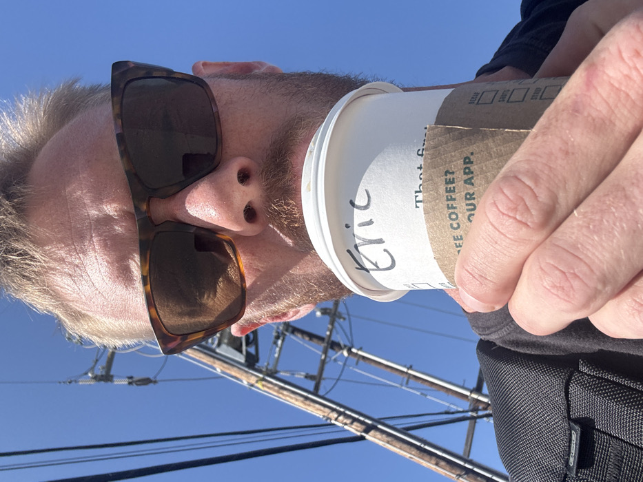 A selfie capturing a man with sunglasses drinking from a white coffee cup labeled "Eric