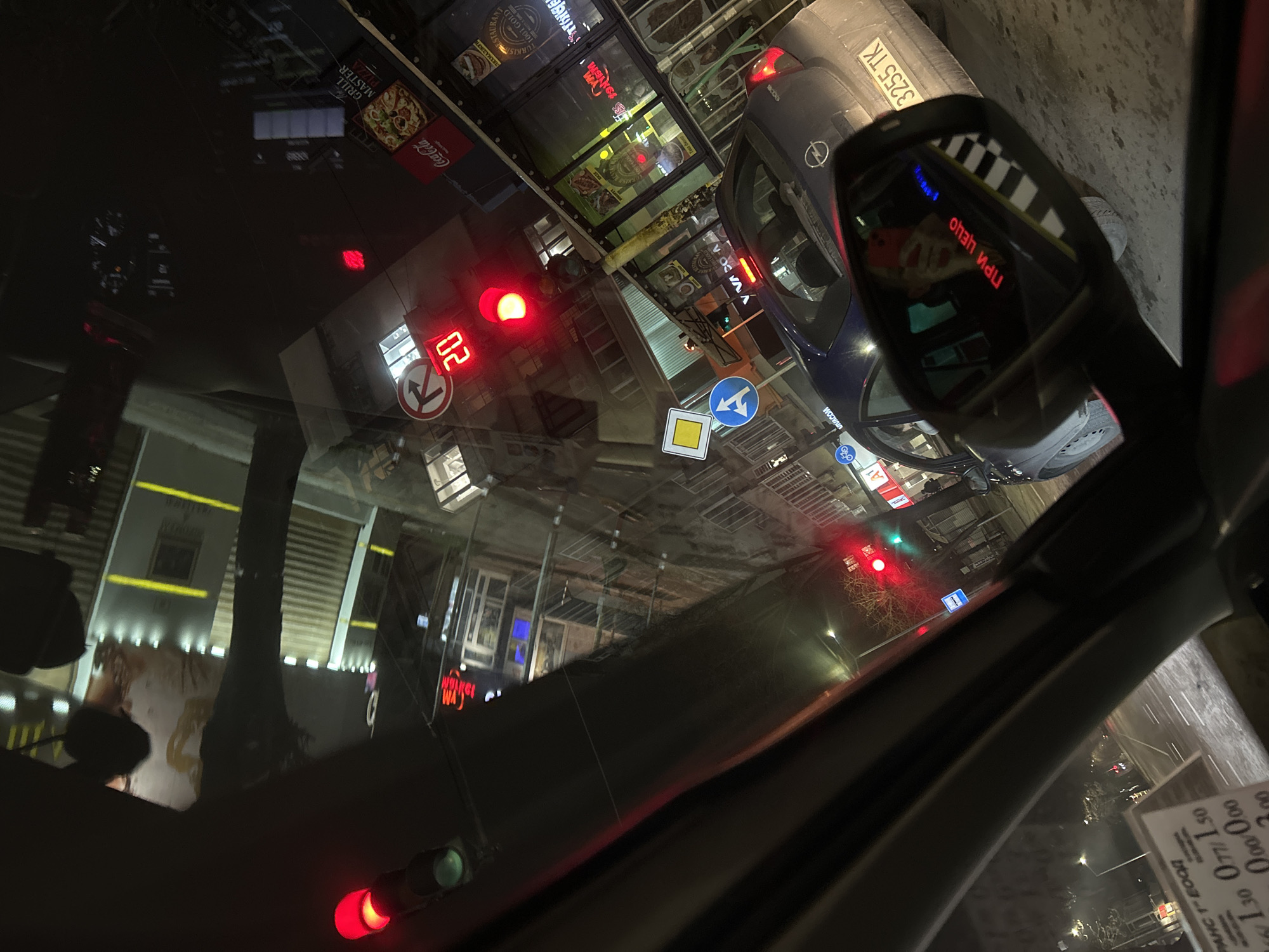 view from inside a car at night. The windshield reflects various elements of the urban landscape. On the left, there are illuminated advertisements for "Grill Master Pizza", "Coca-Cola", "A1", "VIVACOM", "CYM", "1001 Gold Restaurant" and "Strangers Lounge Bar". A digital traffic light displays the number "20", likely indicating the speed limit in kilometers per hour. There is a no-U-turn sign next to the traffic light. Other road signs are also visible. Outside the car, another car is parked, with the license plate "3255 TK". The side mirror of the car reflects a person with the text "ПРИ ЦЕЦО" visible upside down. The image likely shows a street in Varna, Bulgaria.