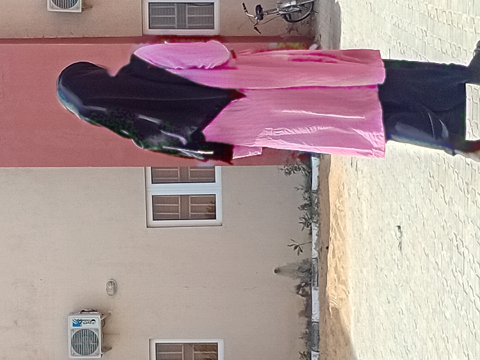 The scene, located in Kwazailewa, Nigeria, depicts one individual viewed from behind, positioned on a surface paved with light-colored interlocking pavers. The individual wears a black hijab covering the head and shoulders, a loose-fitting pink tunic, and dark trousers or a long skirt, with dark footwear visible. To the left, a beige building wall features two rectangular windows with white frames and vertical mullions, an oval light fixture, and a white "Gree" air conditioning unit mounted above. To the right, a rose-colored building wall displays one similar window and a partially visible white air conditioning unit mounted higher up. A low white concrete curb separates the paved area from a sandy strip with sparse green vegetation along the base of the beige wall. A light-colored standard-frame bicycle leans against the rose-colored wall on the right. A light-colored, cloth-like object or debris is visible in the sand near the beige wall. The scene is illuminated by bright natural sunlight.