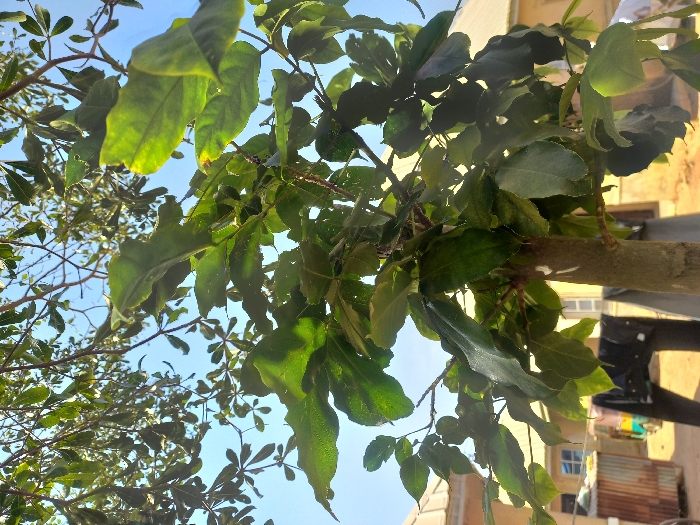 The image depicts an outdoor scene in what appears to be a residential or semi-urban area within the city of Jos, Nigeria. In the foreground and midground, a tree with a light-colored trunk and abundant green foliage dominates, obscuring parts of the background. Sunlight illuminates the leaves, casting shadows. In the background, two light-colored buildings with pitched roofs are partially visible. The building on the left features a visible window. Adjacent to this building, a structure composed of corrugated metal sheets stands, and a portion of a yellow and blue three-wheeled vehicle is discernible behind it. Dark trousers are observed hanging on a line or rail between the tree and the left building, alongside lighter-colored garments hanging on the right side. The sky above is clear and blue, visible through the tree canopy. The ground surface appears to be dry earth. No individuals are present in the frame, and no dynamic actions are depicted beyond the static drying of clothes.