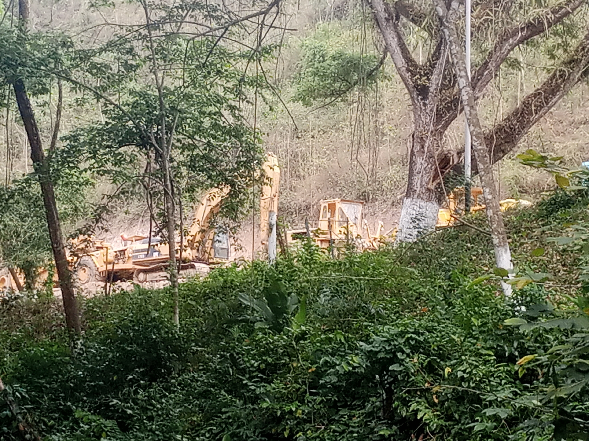 heavy machinery, including at least one bulldozer and an excavator, operating in a wooded area near Tinaquillo, Venezuela