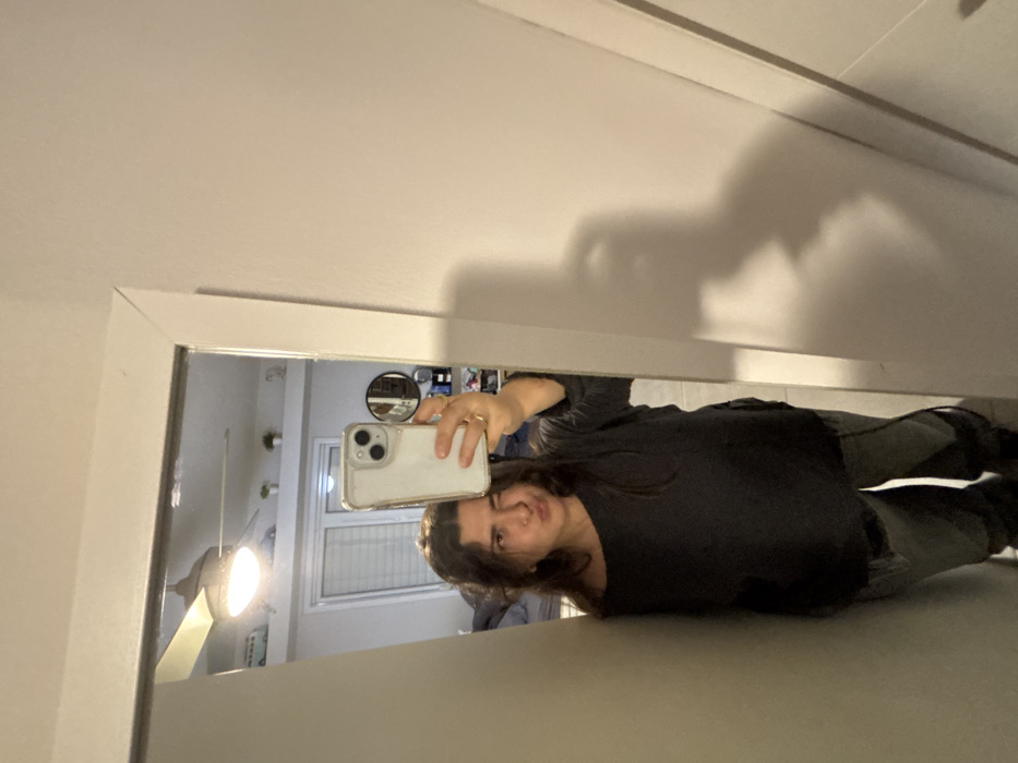 A woman takes a mirror selfie, holding an iPhone with a clear case. She wears a dark-colored top and pants. Reflected behind her is a bedroom with a ceiling fan and a window with blinds. The wall above the mirror casts a shadow from the phone and hand holding it. The mirror has a white frame.