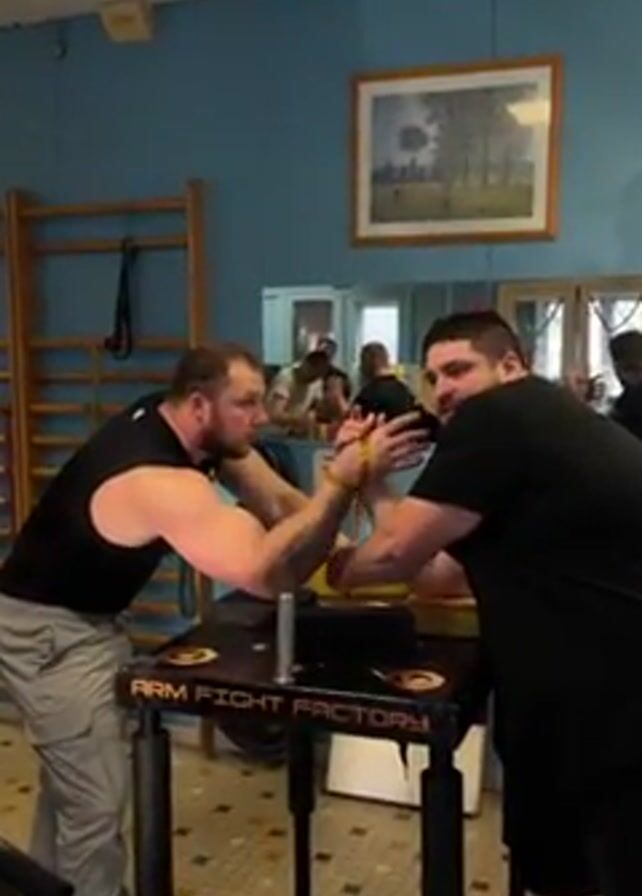 Two men stand at an arm wrestling table, their arms gripped and ready to compete