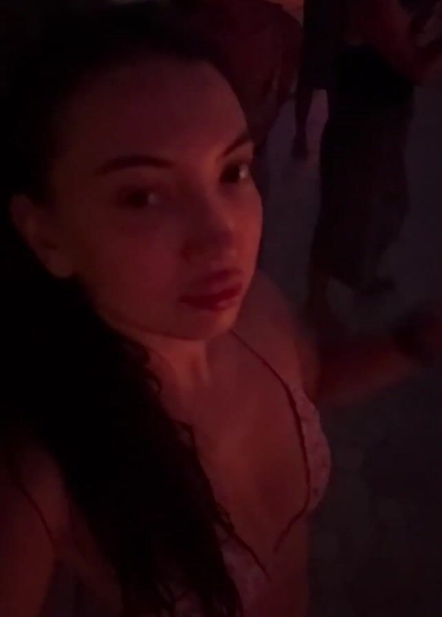 woman taking a selfie at a party or outdoor event at night. In the first frame, she appears to be indoors, possibly in a club, with blurred figures and blue and purple lighting in the background. Then she moves to an outdoor setting featuring a large fire pit with several people sitting around it. The environment is lit with colored lights, creating a party-like atmosphere. The woman is wearing what appears to be a bikini top and has long dark hair. She is holding the camera at arm's length to capture the scene.