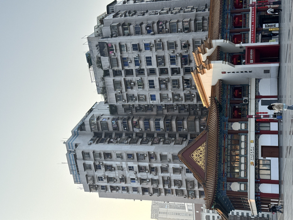 The image displays a contrasting urban landscape within Yuzhong District, China. In the immediate foreground, a traditional Chinese architectural complex with ornate, multi-tiered, terracotta-tiled roofs, featuring vibrant red, blue, and gold decorative elements on its eaves and gables, is centered on a paved plaza. Red lanterns hang from the structure. One section of this building is identified as a "CHILDREN'S ART CENTER" through English and Chinese signage. Behind and towering over the traditional complex are two densely packed, multi-story residential high-rise buildings, appearing to be approximately 20-30 floors tall. These structures feature light-colored, possibly grey or off-white, facades. A multitude of individual air conditioning units are visibly mounted on the exterior walls and balconies of nearly every floor. Some balconies also show draped laundry. The buildings exhibit a worn, functional aesthetic common in dense urban environments. A third, more distant high-rise is faintly visible on the far left. On the paved plaza, a lone individual, dressed in a light-colored jacket and jeans, stands centrally, facing away from the viewer, seemingly engaged with a mobile device. Two other figures are partially visible walking on the left side of the plaza. The sky above is a uniform, light, hazy grey, indicative of daylight conditions with diffuse lighting. The ground is a flat, reflective, paved surface.