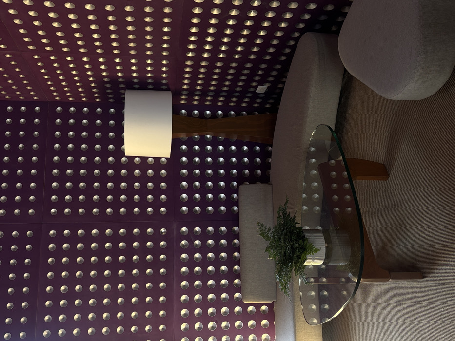 This image depicts an interior lounge area located in Playa del Carmen, Mexico. Two walls forming a corner are visible, both uniformly covered with deep purple panels that are studded with numerous regularly spaced, circular, reflective metallic concave elements. A tall floor lamp with a white cylindrical shade and a dark, sculpted wooden base stands in the corner, illuminating the space and creating reflections on the right wall. A curved, light-colored upholstered sofa or bench spans along the left and back walls. In front of the sofa, a triangular-shaped glass coffee table with three dark wooden legs is positioned. On the coffee table, a small potted fern in a white, fluted planter serves as a centerpiece. To the right, a smaller, rounded, light-colored upholstered ottoman is present. The floor is covered with a light-colored, textured carpet. No individuals are depicted within the scene.