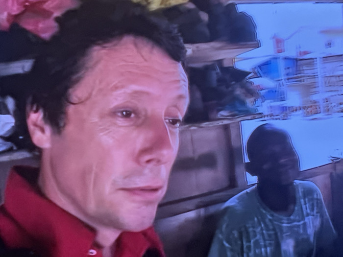 The image depicts two male individuals in an indoor setting within the city of Colombes, France. In the foreground, positioned to the left, is a light-skinned male with dark, wavy hair, visible wrinkles on his forehead and around his eyes. He is wearing a red collared shirt and exhibits a neutral, slightly contemplative expression, with his gaze directed downwards and to the right. Behind him and to the right, partially obscured, is a second male, appearing younger, with dark skin and short, dark hair. He is dressed in a light-colored, patterned t-shirt, and his face is partially shadowed. The background features horizontal wooden planks, suggesting a wall or structure, with an indistinct, blurry area above that includes shades of blue and white, possibly distorted reflections or out-of-focus elements. No direct interaction or specific action is discernible between the two individuals. The image quality suggests a photograph of a digital screen.