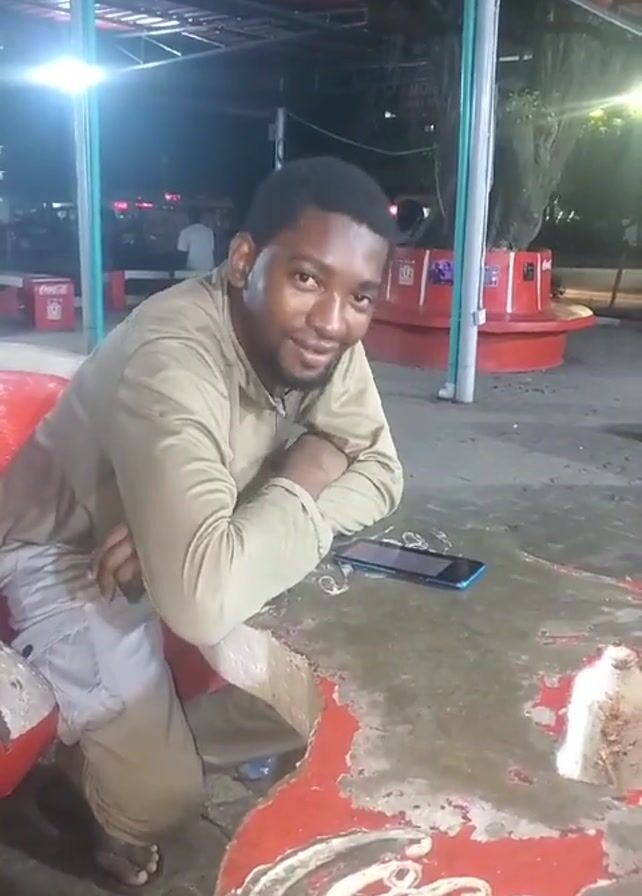 A man is sitting at a round Coca-Cola branded table outside at night. He is wearing a beige long-sleeve shirt and tan pants, and he is barefoot. The table has a faded red Coca-Cola logo painted on it. The man is looking at a tablet on the table, then he smiles at the camera. There are other people and structures visible in the background, including red Coca-Cola trash cans and a covered area with lights. The man speaks after smiling at the camera.