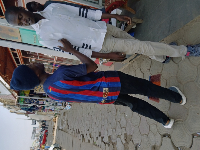 The image depicts a daytime street scene in Mumbwa, Zambia, featuring two adult males in the foreground on an uneven grey interlocking paver sidewalk