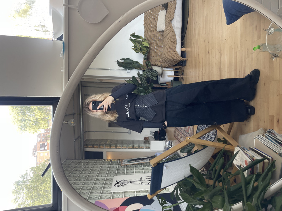 An individual with blonde hair is captured mid-body in a mirror selfie, their face obscured by the black smartphone they hold. They are wearing a black long-sleeved ribbed top, a black short-sleeved t-shirt with reversed white text appearing to read "Gandh Paris," a grey pinstriped corset-style vest, loose-fitting black trousers, and black platform shoes. The setting is an interior space with light wooden floorboards and white walls. To the left, a wooden deck chair with a patterned fabric seat is visible, positioned near a stack of books and a green potted plant. Behind these, several art pieces rest against the wall, including a colorful abstract work and a black-and-white drawing. A section of wall composed of glass blocks is also present. To the right, a light brown woven sofa or daybed is covered with a chunky knitted blanket and a white cushion. Numerous potted plants are scattered throughout the room. The ceiling features exposed pipes and a bare hanging lightbulb. Through a large window in the background, green treetops and multi-story brick residential buildings are visible under a bright sky, indicative of an urban environment. A small clear bottle of hand sanitizer is on the floor in front of the mirror. The architectural style of the interior, characterized by high ceilings and exposed utilities (consistent with a loft conversion), combined with the exterior view of brick residential buildings, is typical of urban areas in London, United Kingdom.