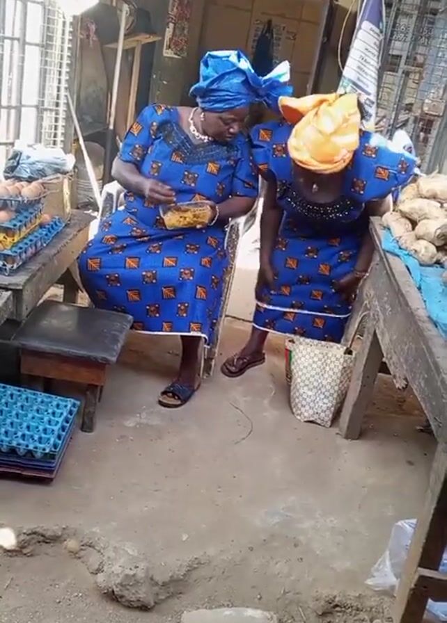 The scene shows two women in matching blue dresses with an orange and brown pattern, standing in front of their market stands. One woman is seated, eating from a bowl with a spoon, while the other stands with her hand on a table displaying yams. A man in a brown shirt walks past them. The background includes eggs, a POS sign, and metal bars. The ground is uneven and partly dirt.