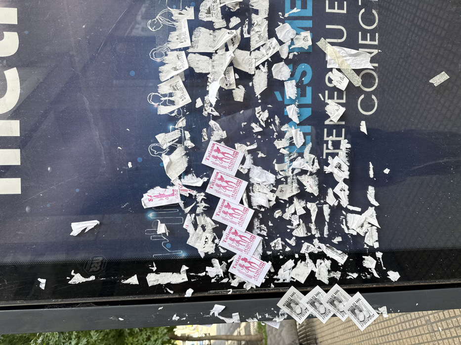 A street-level advertisement board shows remnants of torn-off posters and flyers