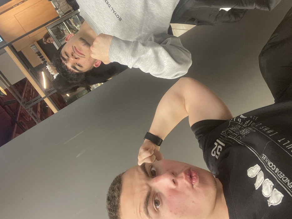 Two young adult males are prominently featured in an indoor selfie photograph taken within a modern commercial establishment, likely a cafe or food court, located in Sofia, Bulgaria. The individual in the foreground on the left, a fair-skinned male with short brown hair, is wearing a black t-shirt and a black smartwatch on his left wrist. He is captured in the act of posing for the camera, pouting his lips, raising his left eyebrow, and flexing his left bicep. To his right, partially visible behind a large, angled grey structural column, is a second young adult male with dark, curly hair and a trimmed beard and mustache. He is wearing a light grey long-sleeved sweatshirt with "ROYAL DENIM" printed on the chest, and he is posing with his chin resting on his right fist, looking towards the camera. The background shows elements of a commercial service area, including a dark-colored counter, glass display cases, and shelving with various containers. Exposed industrial-style ceiling structures with dark beams, track lighting, and reddish-brown segments are visible above. Several indistinct individuals are present in the far background behind the counter, including one person with dark hair and another with reddish hair, suggesting a public environment with staff and patrons.