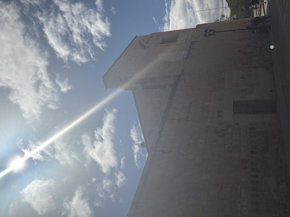 A low-angle, sun-drenched view captures a historic stone structure against a sky with scattered clouds. The sunlight flares intensely at the bottom left, casting a bright beam across the image. The building exhibits traditional masonry with visible windows and architectural details. The scene is bathed in warm tones, highlighting the weathered texture of the building and the brightness of the sky.
