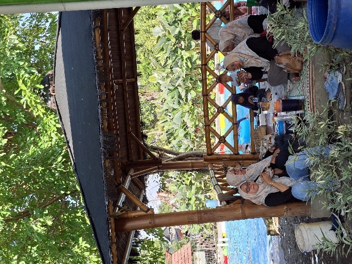 group of people sitting under a bamboo hut with a black tarp roof at a swimming pool in Kecamatan Tulung, Indonesia (coordinates: -7