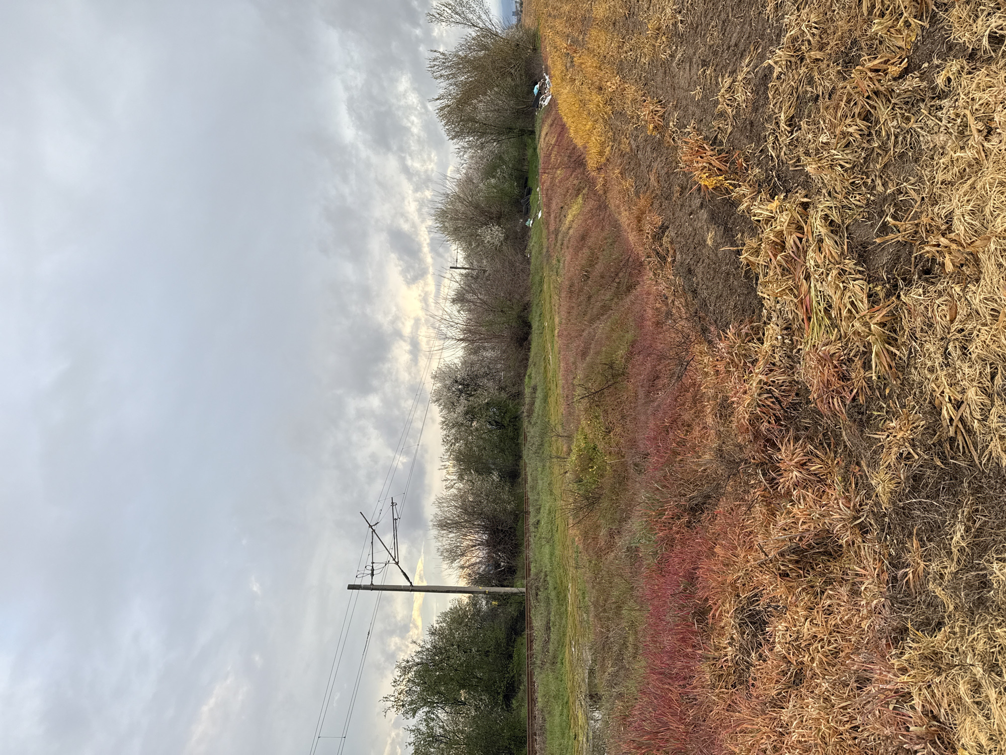 The image depicts an outdoor scene in Trud, Bulgaria. A utility pole with power lines stands along a railway track. To the right of the tracks is a field of mixed vegetation, including red, yellow, and brown foliage. Trees line the area between the tracks and the vegetation. The sky is overcast with clouds. There appear to be white objects on the ground towards the middle of the image along the side of the trees.