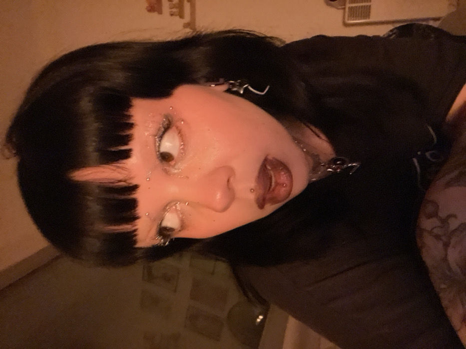 A woman with dark hair and bangs is captured in a close-up, tilted shot. She has glittery makeup around her eyes and multiple facial piercings. Her tongue is visible, also pierced, adding to an edgy aesthetic. She wears a dark-colored top and a silver necklace, and a tattooed arm is partially visible in the bottom right. The backdrop consists of dimly lit interiors, with a few items possibly hanging on the wall in the background.