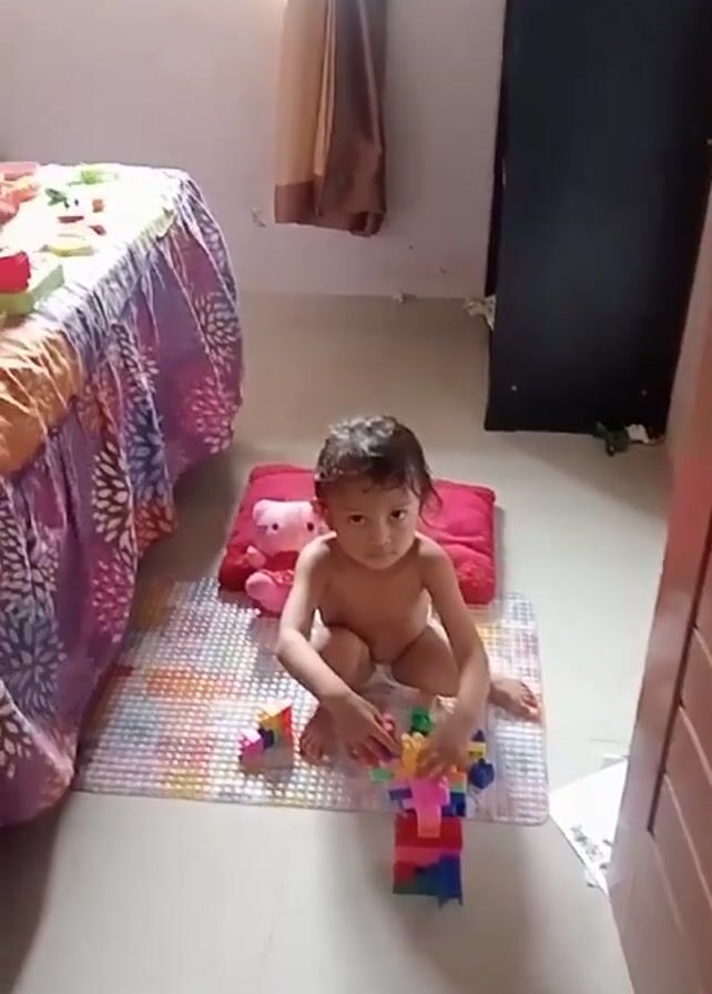 A young child is sitting on a colorful play mat in a bedroom, building with colorful plastic blocks. The child has wet, dark hair and is not wearing clothing. A pink stuffed animal rests on a red pillow behind the child. To the left is a bed with a purple and pink patterned bedspread. A black cabinet is against the wall on the right side of the frame, next to a wooden door. A small window is at the back of the room. The child looks at the camera, laughs, and throws their hands up. A piece of paper is on the floor to the right of the mat.