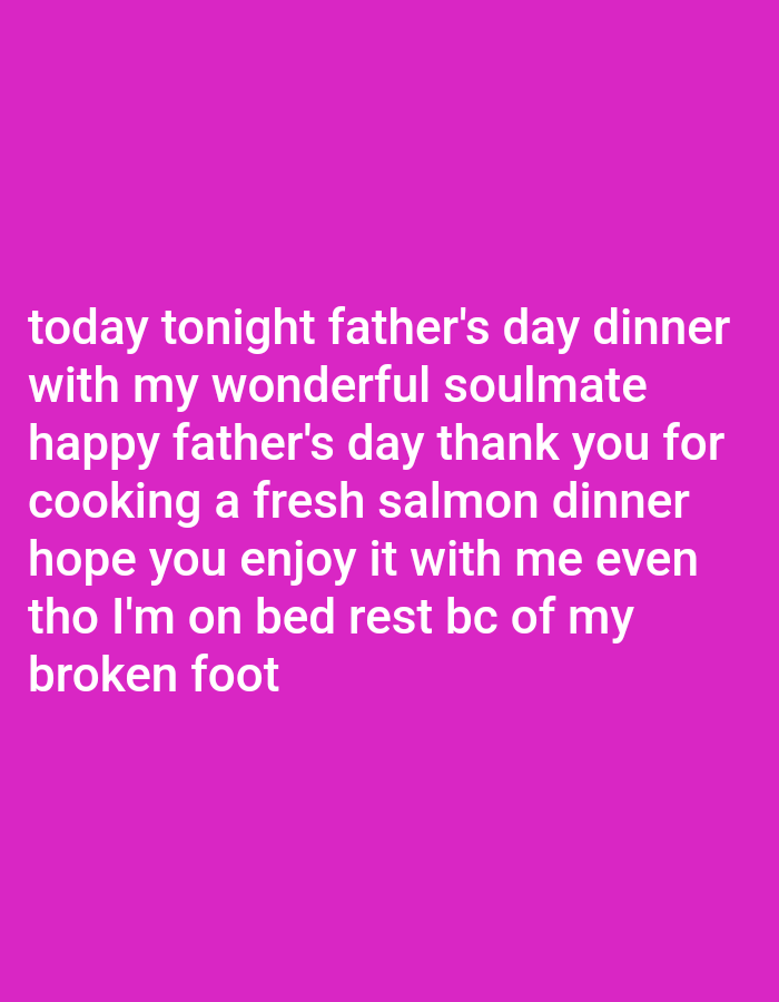 A fuschia background displays white text indicating a Father's Day celebration. The message expresses gratitude to a soulmate for preparing a fresh salmon dinner. Due to a broken foot requiring bed rest, the author hopes the recipient enjoys the meal. The phrases "today tonight" and "happy father's day" appear together.