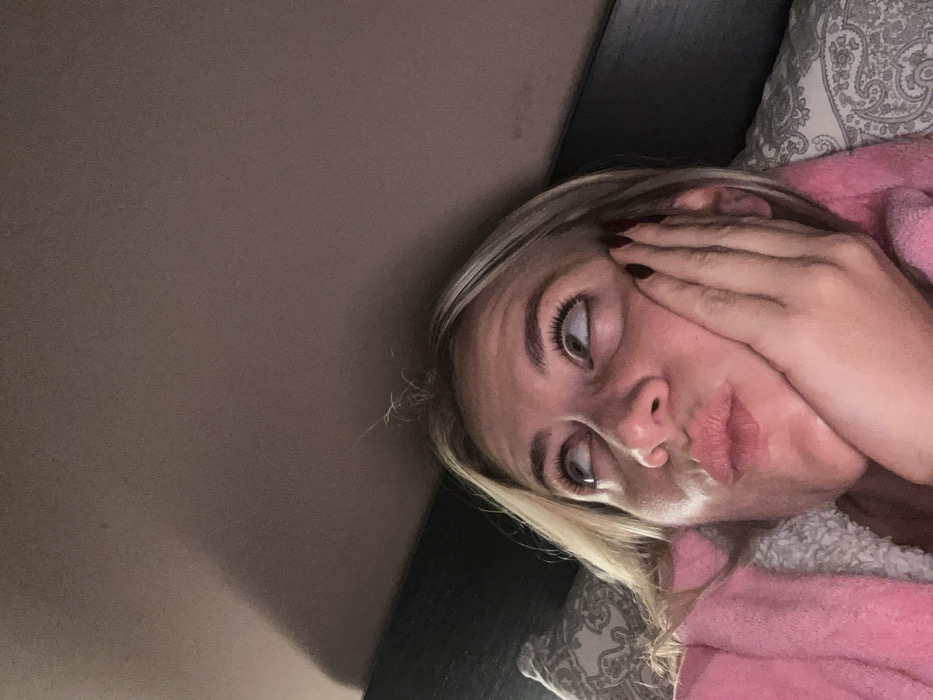 A blonde woman wearing a pink robe is resting in bed, with a patterned pillow behind her. She's holding her face with her hand, eyes glancing upward with a contemplative expression. Her lips are pursed slightly. The background is a plain, neutral-colored wall, creating a simple, intimate setting. The lighting suggests a dimly lit room, possibly in the evening.