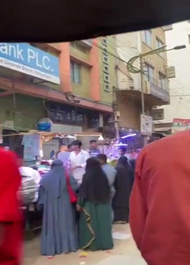 crowded street scene. The camera's point of view is behind a person wearing a red shirt. In the background, there are several buildings, including a bank. A market scene is evident with vendors selling clothing and other goods. There are people walking by, many wearing traditional Islamic clothing. Several yellow autorickshaws are parked along the street. Overhead are power lines and street lights.