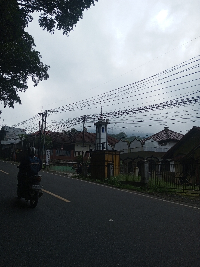 The image portrays a street scene in Sandamal Eliya, Sri Lanka, captured on an overcast day. A dark asphalt road with a faded yellow line on its left side occupies the foreground. A lone individual, wearing a helmet and a dark jacket with a blue backpack, rides a dark motorcycle away from the viewer on the left side of the road; the motorcycle's license plate displays "P 2175 ID". On the right side, a white mosque with an distinctive undulating roofline and a prominent minaret is visible. The minaret features a blue-tinted window and multiple loudspeakers at its top, and the mosque's roof is adorned with a crescent moon finial. In front of the mosque, a dark metal fence with concrete posts borders the property, with some grass visible. A small, square, yellow utility box is positioned between the road and the mosque's fence. To the left of the mosque, a house with a reddish-brown tiled roof is present, and other similar structures are partially visible further down the street on the left. Numerous black electrical and communication cables traverse the upper-mid section of the frame, suspended from utility poles. Dark green foliage from trees frames the upper left corner. The background features misty hills beneath a uniformly gray, cloudy sky.