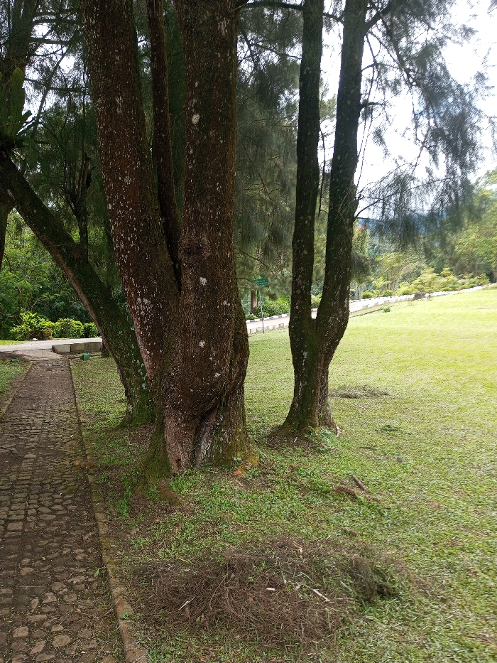 A park scene shows a stone pathway on the left, bordering a lawn area to the right. Several trees stand between the path and lawn. One tree's trunk is notably thick and textured, seemingly twisted. The lawn is green, slightly uneven with some brown debris scattered near the tree line. In the background, a glimpse of a manicured garden area with trimmed hedges and a path running along a curb can be seen. The sky is overcast.