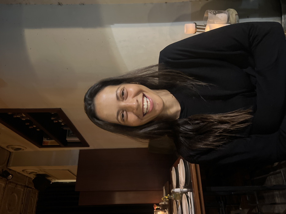 The image depicts the interior of a dining establishment located in Tel Aviv, Israel. A precise street address or venue name is not ascertainable from the visual data. A single female subject is centrally framed, positioned from the chest up. She has long, dark brown hair and an olive skin tone. She is smiling broadly, exposing her teeth, and looking directly at the camera. She is wearing a long-sleeved black top, with her arms folded or resting in the lower portion of the frame. To the subject's left, a dark-surfaced dining table is visible, prepared with two white dinner plates, two smaller white side plates, silverware (forks and knives), clear drinking glasses, a small vase containing yellow flowers, and a salt and pepper shaker set. A lit candle in a clear glass holder is also on the table. The background consists of a light-colored wall on the right and a dark brown panel or door on the left. Mounted on the wall is a dark wooden shelf unit holding various bottles and books. An ornate, possibly metallic or plaster, ceiling with decorative patterns is visible in the upper left. To the subject's right, a stand holds multiple lit white pillar candles, contributing to the overall dim, warm ambient lighting of the scene.