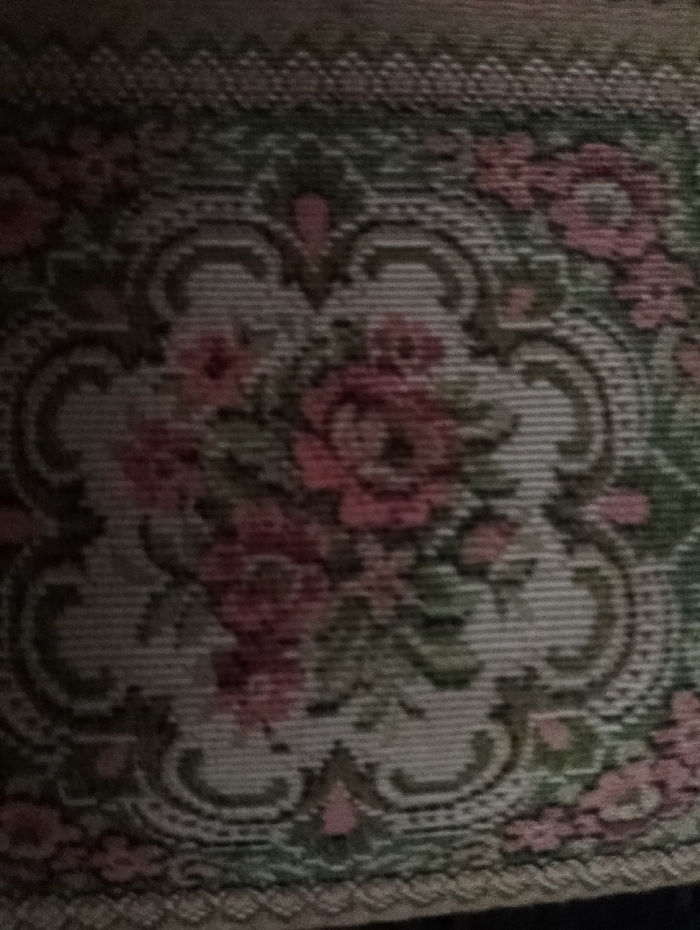 close-up of a patterned fabric. It is a patterned rug with pink flowers and green leaves on a white background. The pattern is floral and intricate. The rug has a small, delicate trim along the perimeter. The coordinates 33.699, -5.369 indicate that the photo was taken in the city of El Hajeb, Morocco. The image is a fragment of a larger rug, with only a portion of it visible. The rug is made of a woven fabric, and the pattern is likely hand-woven or embroidered. The image is poorly lit and has a grainy texture.