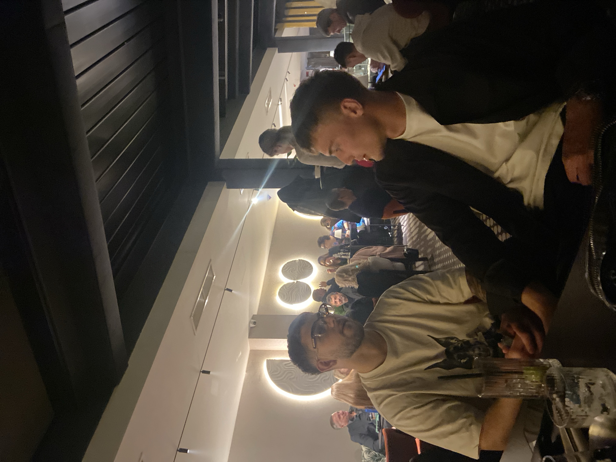 The image depicts an interior scene within a public establishment, likely a restaurant or lounge, located in the city of Varna, Bulgaria. The setting is illuminated by artificial lighting, indicating an evening or nighttime environment. In the foreground, two young adult males are seated at a dark table. The male on the left, with short, curly dark hair and a short beard, wears dark-framed eyeglasses and a light-colored t-shirt featuring a dark graphic of a dog's head. He is looking towards the right. On the table in front of him, a tall, clear glass containing a drink with a straw and a lime wedge is visible, alongside a shorter, partially consumed glass. The male on the right, with short, dark hair, wears a white t-shirt under an open dark jacket and is looking towards the left, appearing to engage with the first male. His hands are resting on the table. The midground and background show numerous other individuals seated at tables throughout the establishment, conversing and socializing. A woman in a light-colored top is standing in the midground, facing away from the camera. The decor includes dark ceilings with recessed track lighting, light-colored walls, and distinctive illuminated wall art featuring a large semi-circular design and two smaller concentric circular designs, both with textured interiors. A security camera is mounted on a wall in the midground. The floor features a dark, patterned carpet.