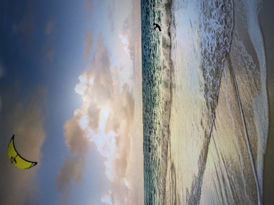 The image depicts an active kitesurfing scene on an ocean beach under a partly cloudy sky