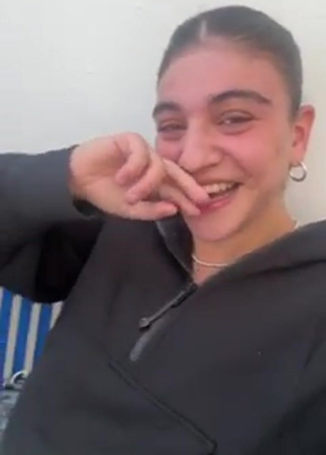A young woman with dark hair slicked back, wearing a black zip-up hoodie and a silver necklace, is sitting on a blue metal bench and laughing. Another person in a black hoodie is sitting next to her, partially visible. The background is a white wall and some greenery. The woman turns the camera towards herself and continues to laugh.