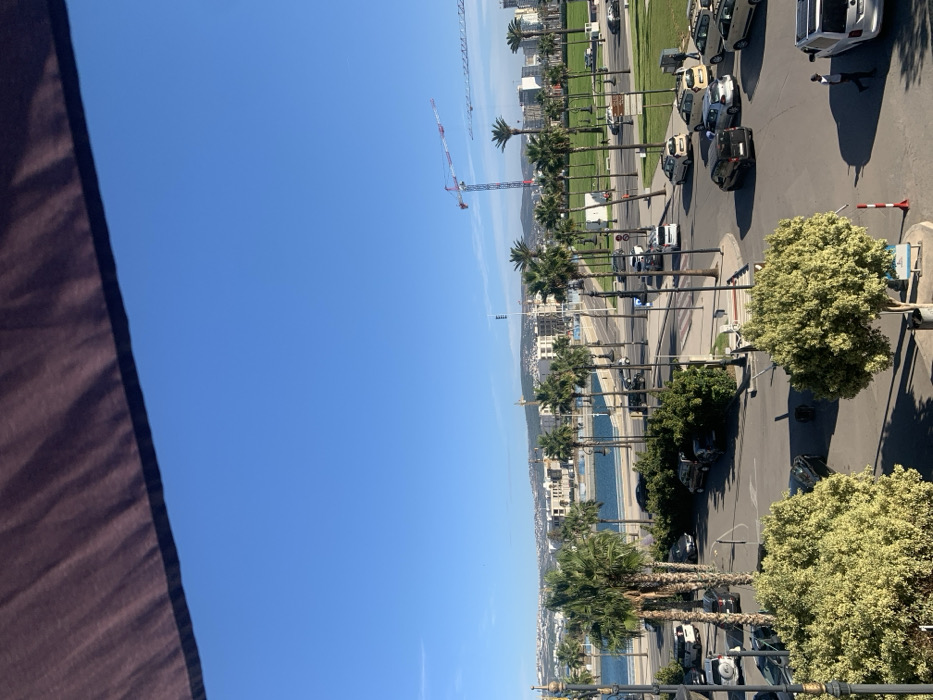 This image presents an elevated, panoramic view of a coastal urban environment in Tangier, Morocco, under a clear blue sky. The top portion of the frame is partially obscured by a dark brown, fabric-like object, likely an awning. The scene depicts a wide promenade and road system running parallel to a body of blue water, likely the Strait of Gibraltar or the Mediterranean Sea. The waterfront features a paved walkway lined with streetlights and numerous tall palm trees. Beyond the water, multi-story buildings line the distant coastline, backed by hills populated with additional structures. The road network includes multiple lanes carrying vehicular traffic, with various cars and vans visible, some in motion and others parked. Vehicle colors include white, black, grey, and beige/yellow (suggesting taxis). Extensive green parkland and manicured grassy areas are situated between and alongside the roads, also populated by numerous palm trees and smaller, bushy green trees. In the mid-ground, at least two large red and white construction cranes are prominent against the horizon, indicating ongoing development. A single individual, an adult male in dark clothing, is clearly visible walking on a sidewalk in the lower right portion of the image, heading towards a white van. The overall lighting suggests bright daylight with strong shadows.