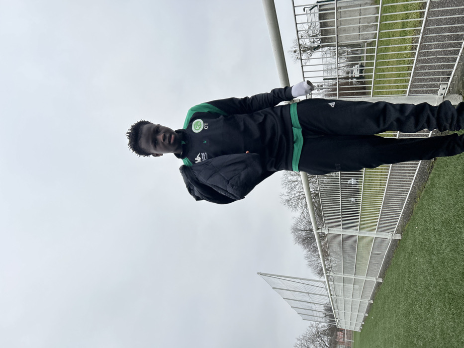 A young male individual with dark skin and short, dark hair stands on an artificial turf sports field under an overcast sky. He is dressed in a black long-sleeved athletic top with green accents on the shoulders and collar, featuring a white "Kappa SPORT CONCEPT" logo on the left chest and a circular green and white logo with "CT" on the right. A green layer of clothing is visible beneath his top. He wears black athletic trousers, possibly Adidas branded, and has a dark, puffy jacket draped over his left shoulder. A white bandage or wrap is present on his right wrist. He looks directly at the camera. Behind him, a white metal fence with vertical bars separates the turf from a gravel path, which is bordered by a taller, angled mesh fence, characteristic of a ball-stop net. Beyond the fences, bare deciduous trees are visible, along with indistinct background buildings including a structure with a red roof on the left and a concrete edifice on the right. Two white vehicles are partially discernible behind the fence line. The scene depicts a sports complex environment within the city of Strasbourg, France.
