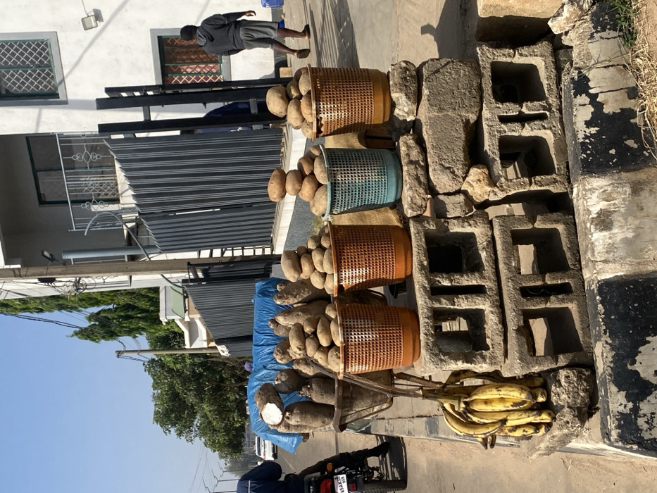 The image depicts a roadside produce display in Unguwar Sarki, Nigeria, under clear daylight conditions