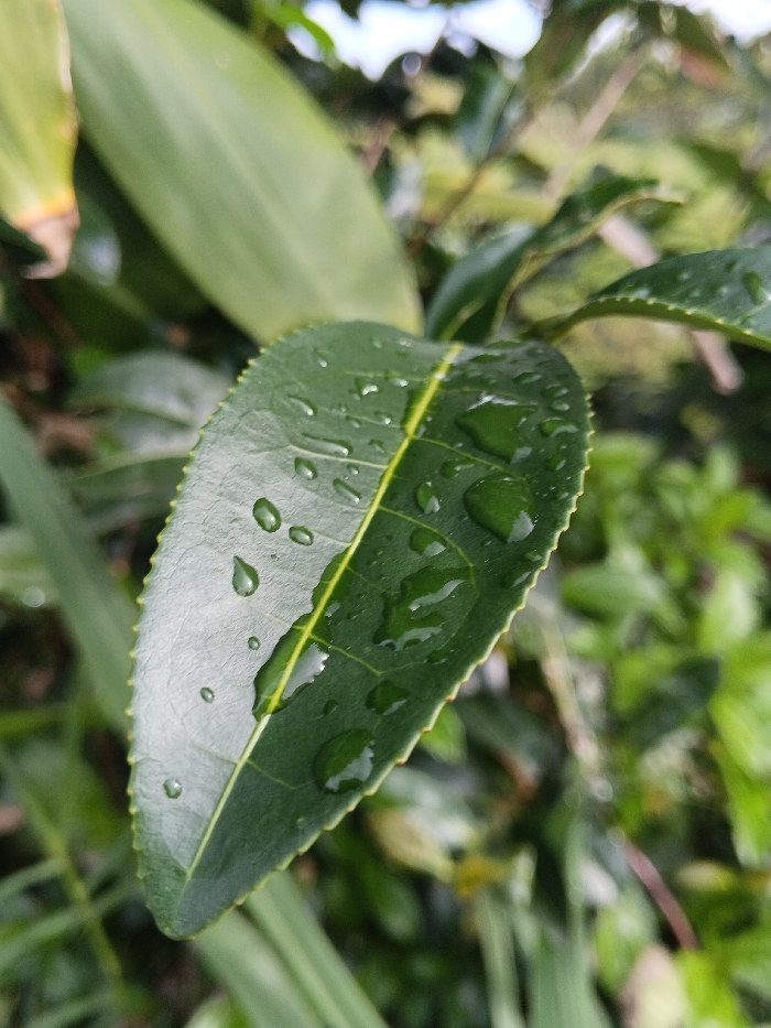 A vibrant green leaf, likely from a shrub, dominates the frame. Dew or raindrops glisten on its surface, highlighting the prominent central vein. Serrated edges detail the leaf's contour. The background reveals a dense array of green foliage, creating a blurred, natural setting. The image captures a fresh, organic aesthetic, emphasizing the leaf's texture and the surrounding greenery.