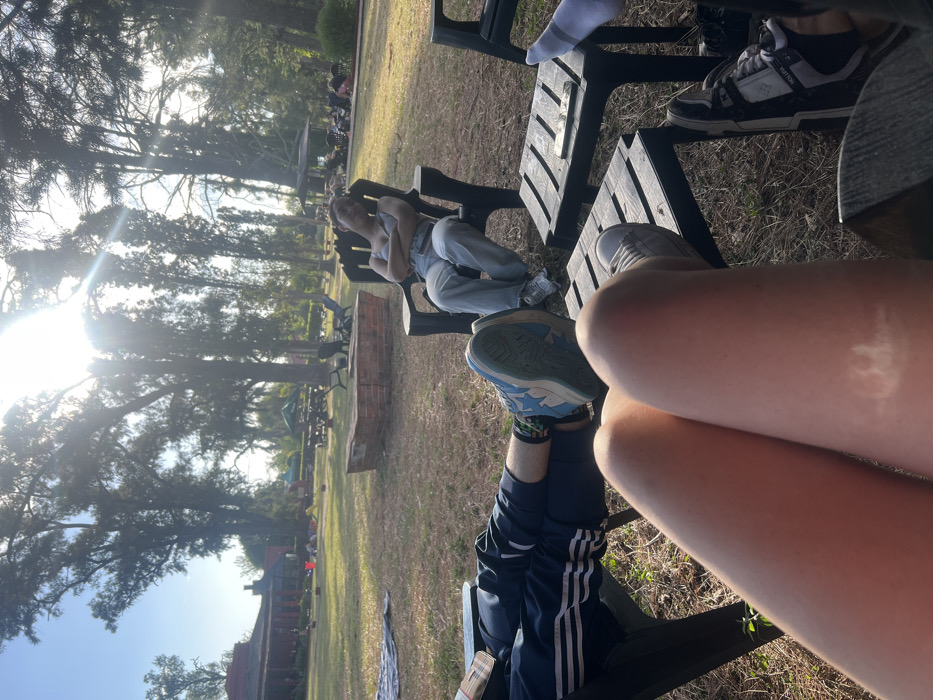 A group is relaxing outdoors on benches. One person in overalls reclines, facing away. Visible are legs and shoes of others. The scene features a grassy area with trees in the background. A brick fire pit stands nearby. The sun is shining brightly, causing lens flare.
